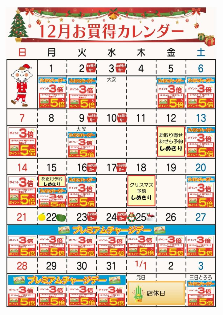 こんにちは、コープ幕張駅北口店 12月のお買得カレンダーです。