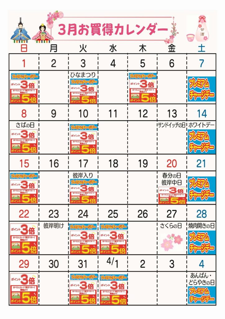 ☆3月お買得カレンダー(みずほ台店)