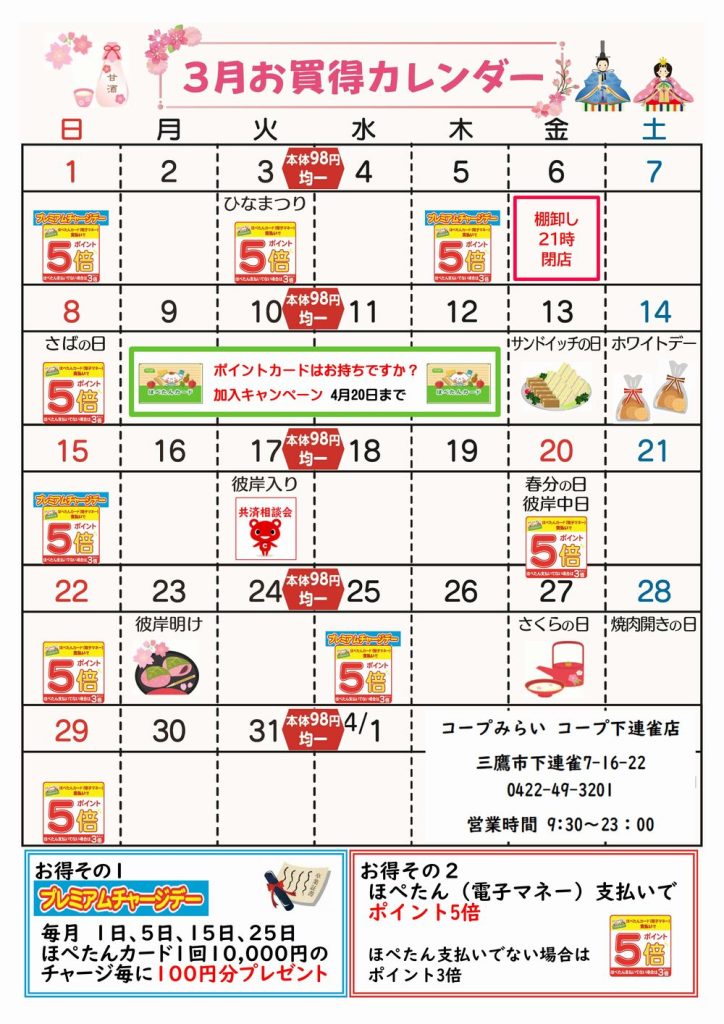 さて、3月のお買得カレンダーをご用意させていただきました。