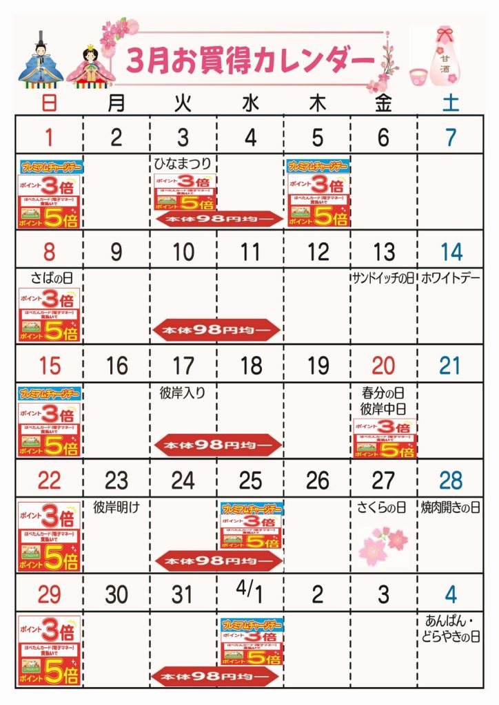 コープみらい国分寺店の3月お買得カレンダーをアップしました。