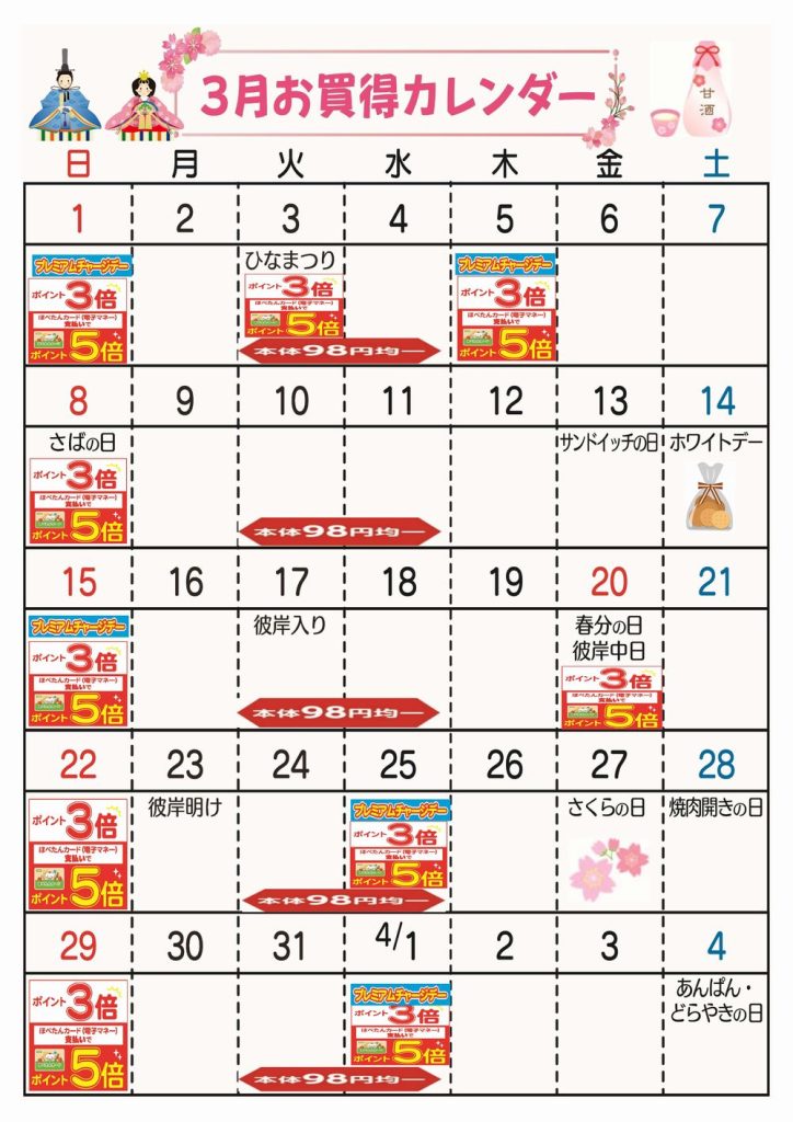 ☆3月お買得カレンダー(小金井ぬくい坂下店)