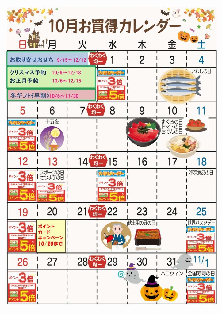 10月のお買得カレンダーをお届けします。