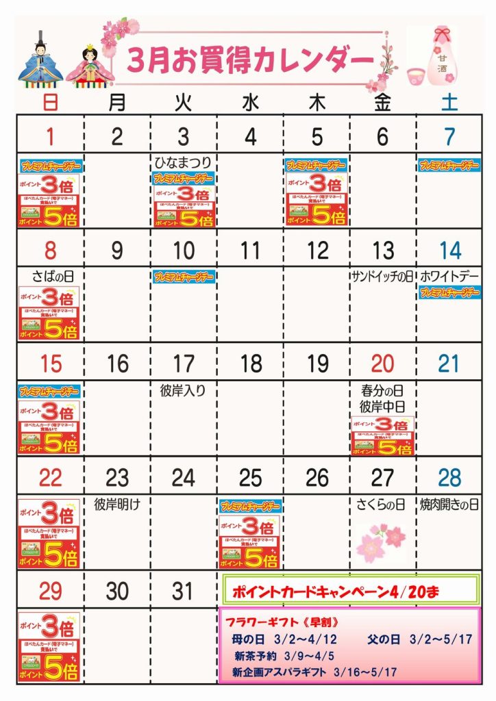 ☆3月お買得カレンダー(東伏見店)