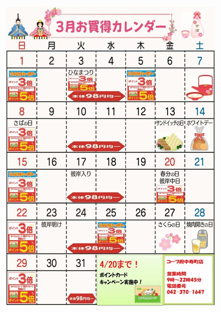 コープみらい府中寿町店の3月お買得カレンダーです。