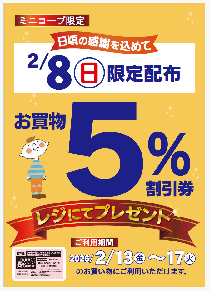 2月8日(日)限定配布 お買物5%割引券プレゼント!
