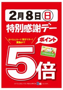 2月8日(日)ほぺたんカード(電子マネー)支払いでポイント5倍