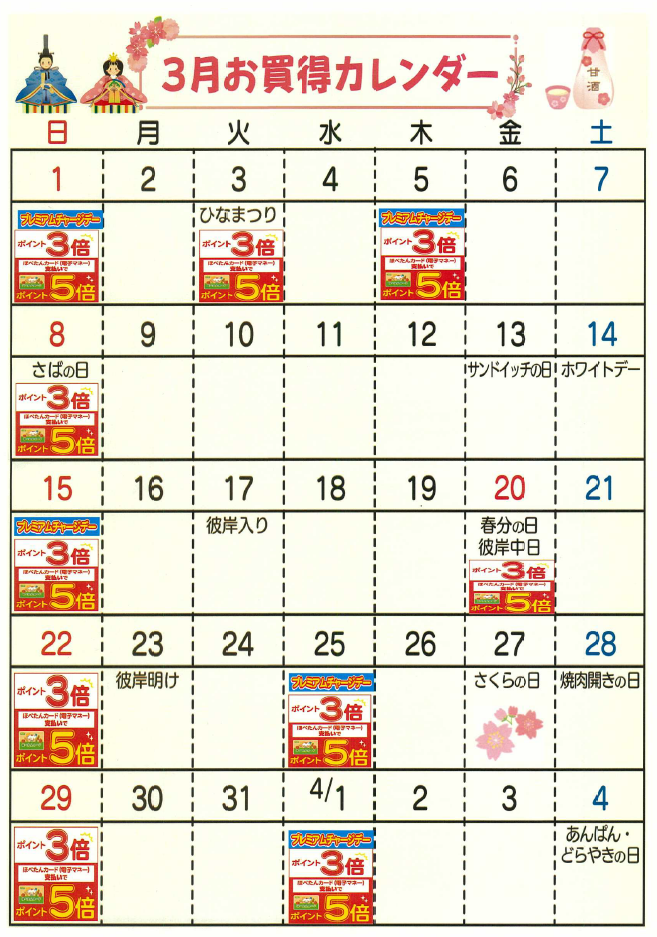 ☆3月度お買得カレンダー(東村山秋津町店)